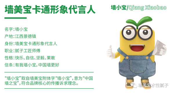 墻小寶是墻美寶的卡通形象代言人。他誕生于景德鎮(zhèn)的工匠世家,他的名字叫“墻小寶”。以方形膩?zhàn)影b為原型作為核心創(chuàng)意,提取了卡通形象識別人物“小黃人”的造型元素,讓卡通形象自帶識別性與記憶點(diǎn)。既反映了膩?zhàn)蛹跋嚓P(guān)輔材產(chǎn)品的特色,又呼應(yīng)了墻美寶的設(shè)計(jì)理念。在建材行業(yè)設(shè)計(jì)中率先使用包裝袋作為吉祥物設(shè)計(jì)的創(chuàng)意,是一次創(chuàng)新,“墻小寶”從頭到腳都充滿了含義。